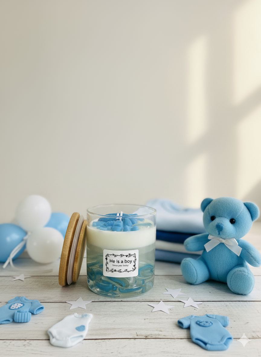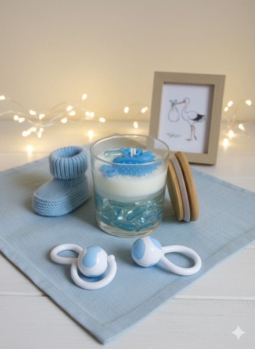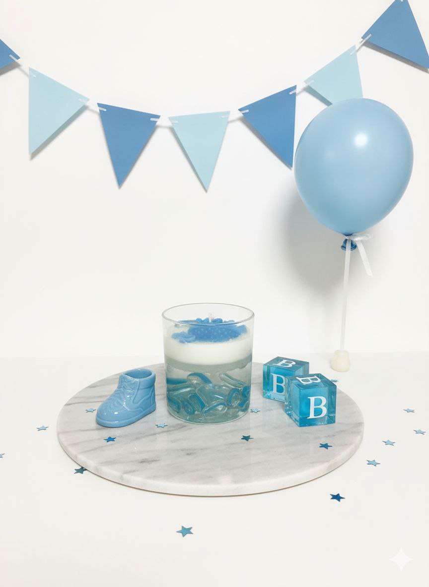 شمعة ديكور آسرة بتصميم مستوحى من أعماق المحيط، ومثالية لإضفاء لمسة جمالية على احتفالاتك بقدوم المولود. تتميز بوعائها الزجاجي الذي يحوي أحجاراً زجاجية ملونة تعكس عبق البحر، مع شمع صويا النقي بالونين أبيض والازرق وتزدان الشمعة بتشكيلات شمعية زخرفية ناعمة مع قطع فنية تخص عالم المواليد، لتجسد جمال وبهجة هذا اليوم البهي في مناسبات الولادة والعقيقة
