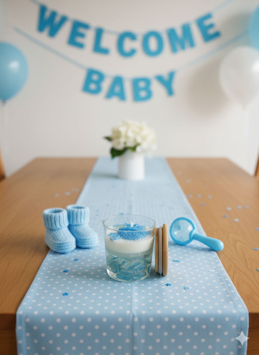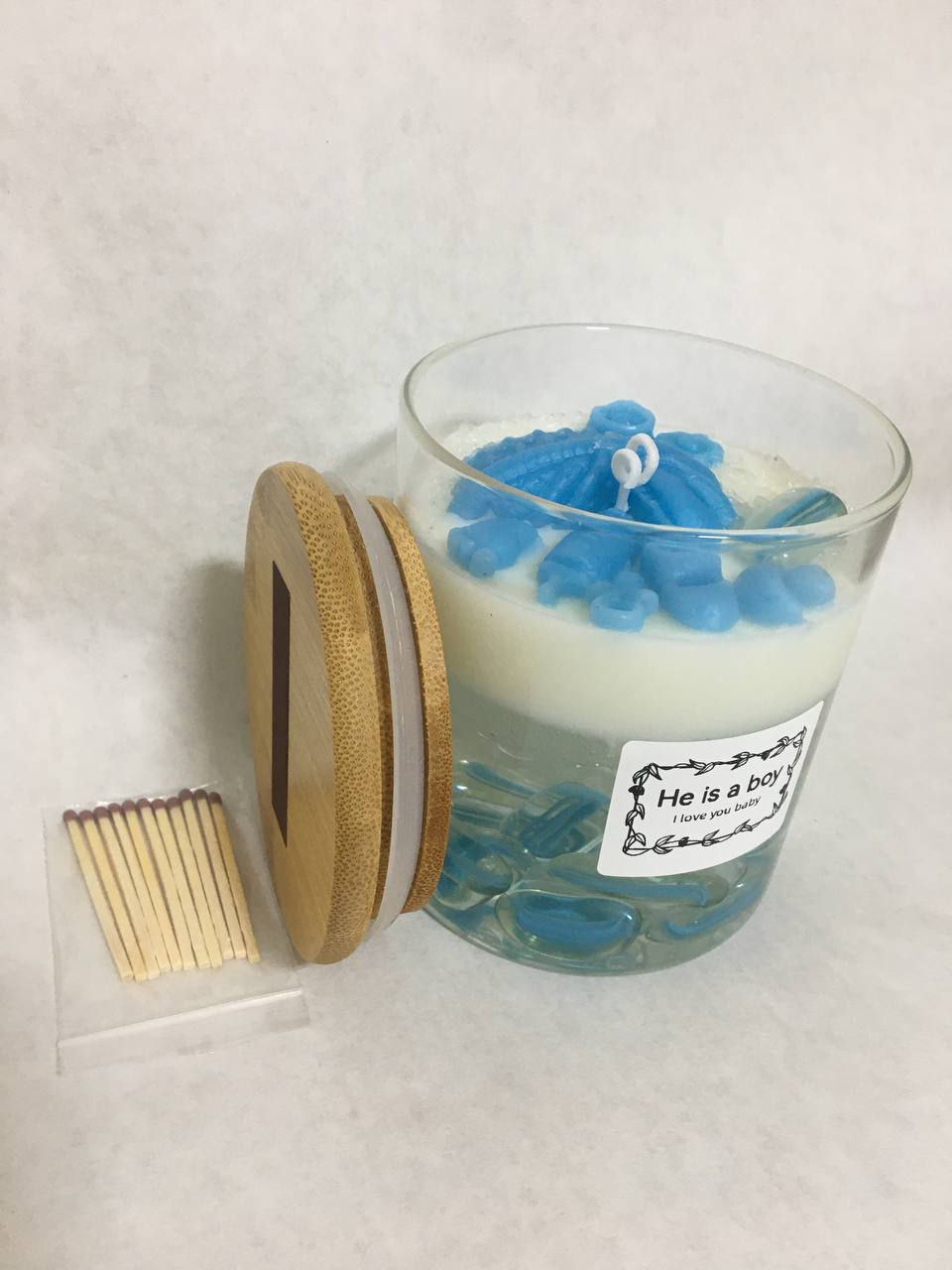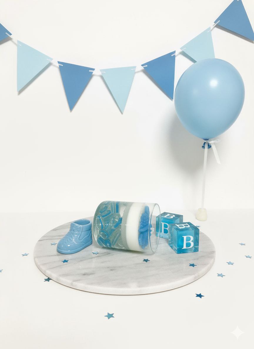 شمعة ديكور آسرة بتصميم مستوحى من أعماق المحيط، ومثالية لإضفاء لمسة جمالية على احتفالاتك بقدوم المولود. تتميز بوعائها الزجاجي الذي يحوي أحجاراً زجاجية ملونة تعكس عبق البحر، مع شمع صويا النقي بالونين أبيض والازرق وتزدان الشمعة بتشكيلات شمعية زخرفية ناعمة مع قطع فنية تخص عالم المواليد، لتجسد جمال وبهجة هذا اليوم البهي في مناسبات الولادة والعقيقة