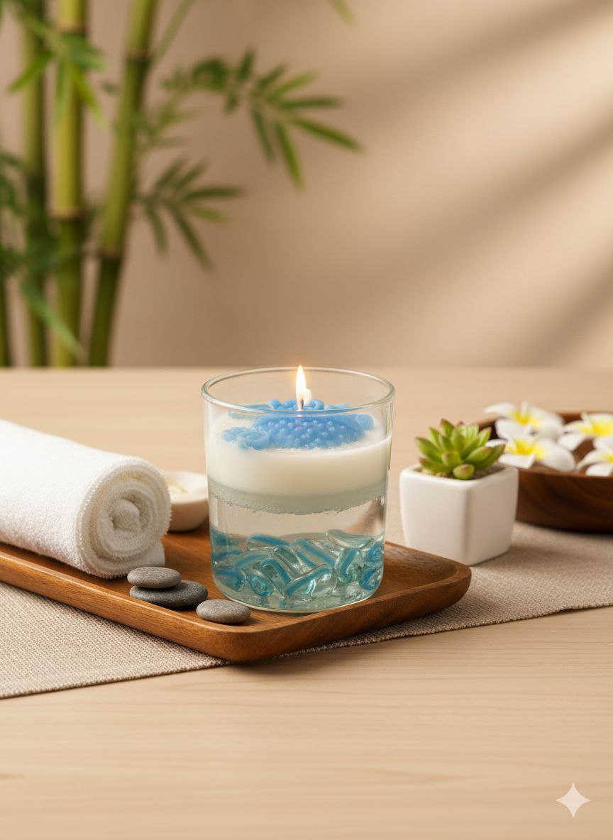 المواد: شمع الجل، شمع الصويا، أحجار زجاجية ملونة